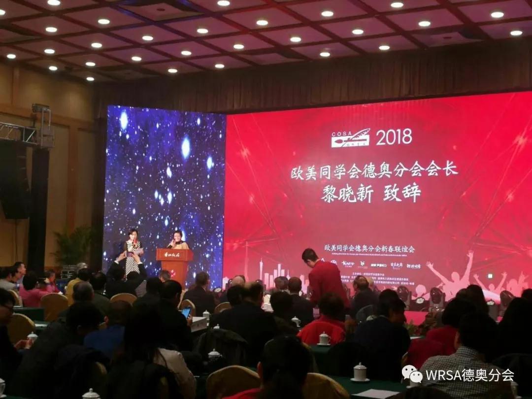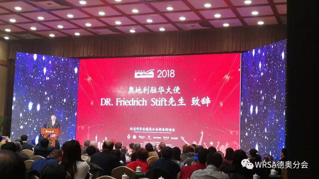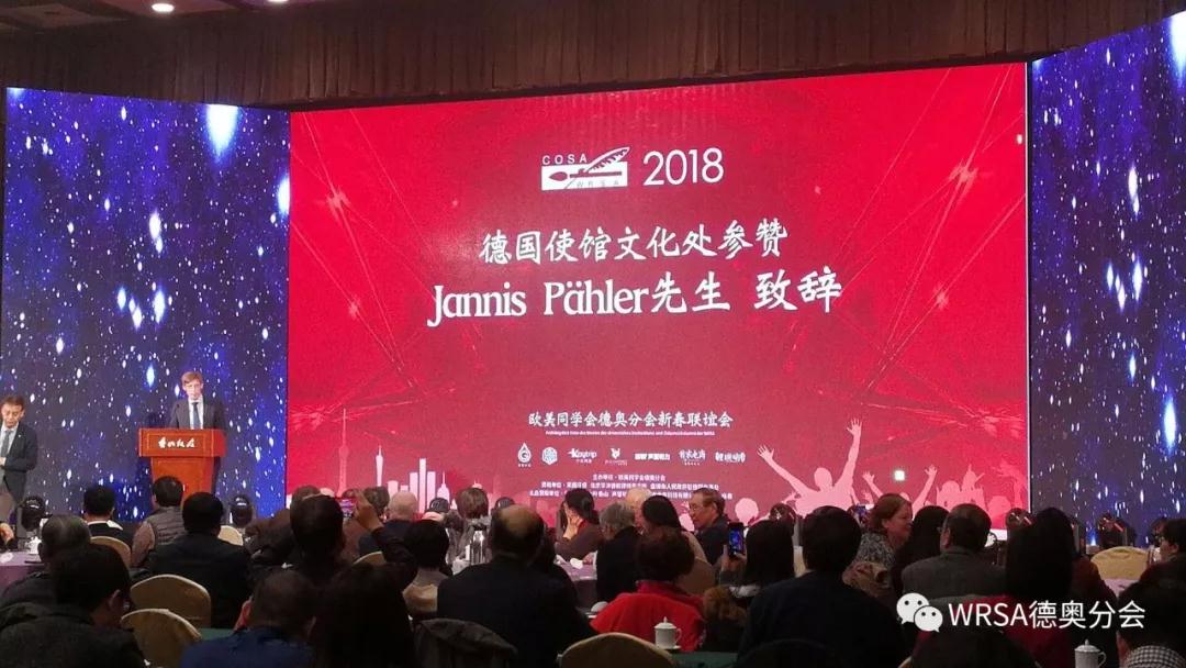 联欢会开始,欧美同学会副会长、德奥分会会长黎晓新博士首先致辞,感谢与会的学长及嘉宾的到来,感谢德奥两国大使馆,各基金会及大学驻华机构一直以来对中德留学之谊,暨对德奥分会工作的大力支持。黎会长特别阐明选址香山饭店作为新春联欢会会场的意旨为“留学海外,报效祖国”,因为香山饭店也是留美华人贝聿铭先生主持设计。黎会长特别提醒德奥分会学长们,响应习近平总书记提出的“不忘初心,牢记使命”的指示精神,提醒各位学长牢记我们留学报国的初心。随后德国使馆文化处参赞Jannis Pähler先生在致辞中回顾了2017年德国的社会文化状况。奥地利驻华大使Friedrich Stift博士先生在新春致辞中分享了中奥两国在2017年的友好合作成果,尤其在旅游业方面中奥两国交流互惠的成果,并盛情邀请大家前往奥地利旅游观光。其后德国文化交流中心的主任Bossmann女士也表达了希望德奥分会不断壮大的殷切希望。