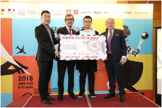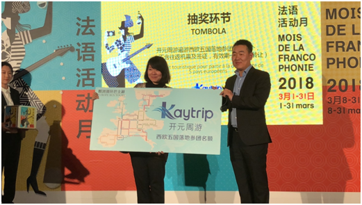(开元周游联合创始人丁佳先生与法国驻华大使,瑞士驻华大使一起为一等奖获得者颁发奖品)