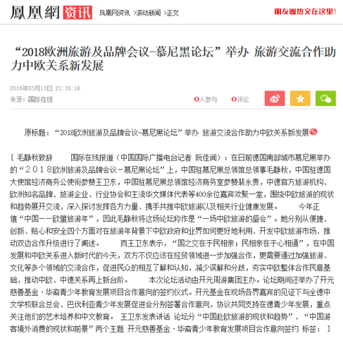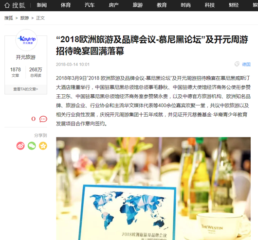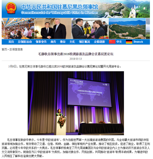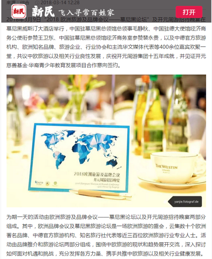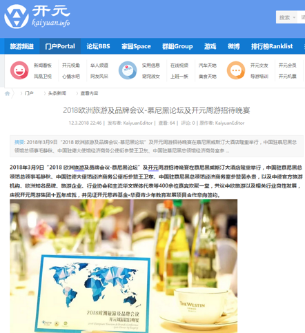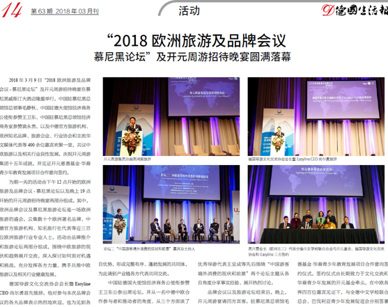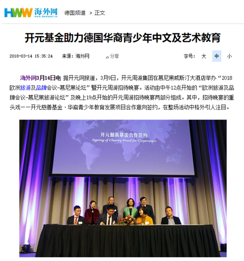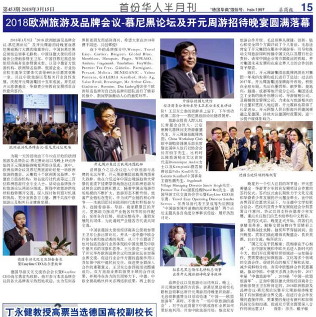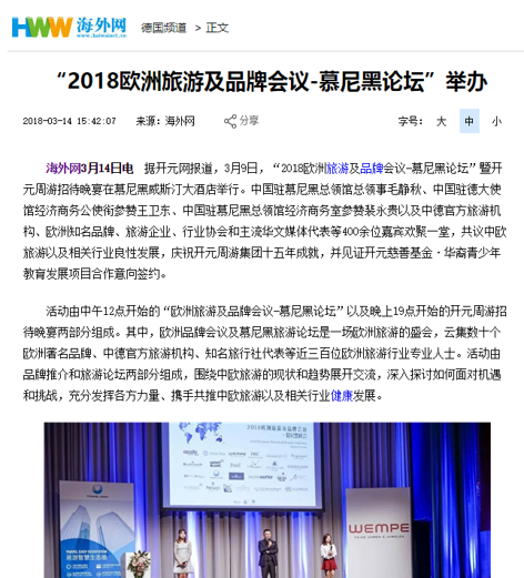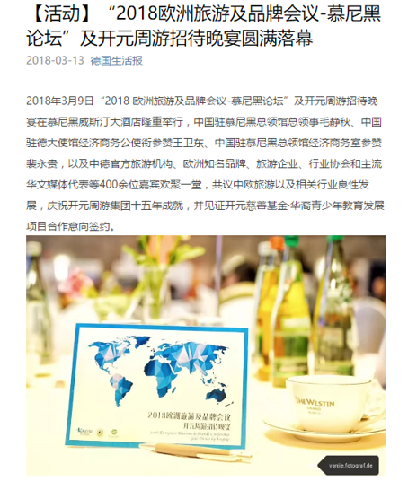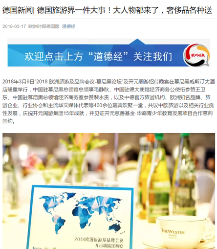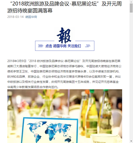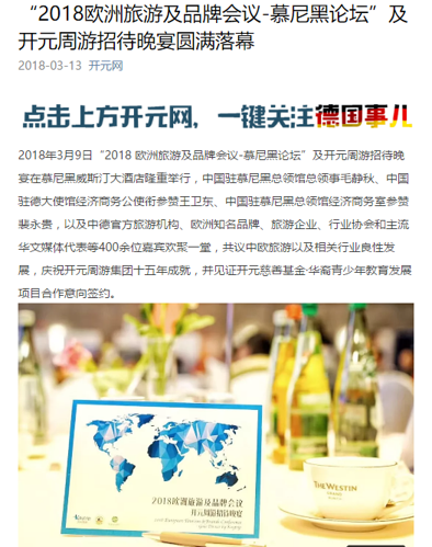以此为背景, 通过各方的通力合作,2018年3月9日“2018欧洲旅游及品牌会议-慕尼黑论坛”及开元周游招待晚宴在慕尼黑威斯汀大酒店隆重举行,中国驻慕尼黑总领馆总领事毛静秋、中国驻德大使馆经济商务公使衔参赞王卫东、中国驻慕尼黑总领馆经济商务室参赞裴永贵,以及中德官方旅游机构、欧洲知名品牌、旅游企业、行业协会和主流华文媒体代表等400余位嘉宾欢聚一堂,共议中欧旅游以及相关行业良性发展,庆祝开元周游集团十五年成就,并见证开元慈善基金·华裔青少年教育发展项目合作意向签约。
