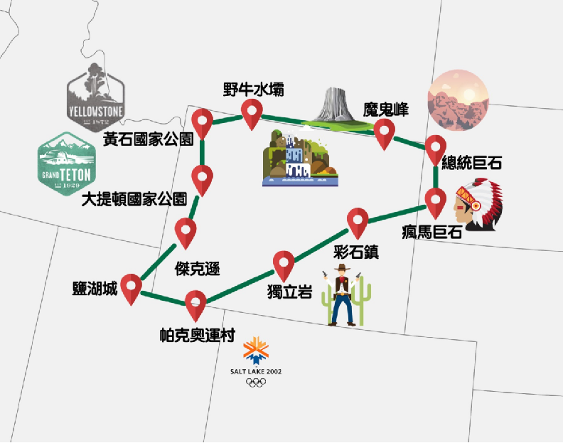 共2个上下车地点 盐湖城-杰克逊-大提顿国家公园-黄石国家公园-野牛水坝-吉列-魔鬼峰-总统巨石-疯马巨石-彩石镇-独立岩-帕克奥运村-盐湖城市区游-大盐湖--盐湖城