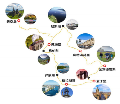 行程索要:爱丁堡-格拉斯哥-罗蒙湖-苏格兰高地-格兰芬南-威廉堡-尼斯湖-天空岛-威廉堡-皮特洛赫里-圣安德鲁斯-爱丁堡