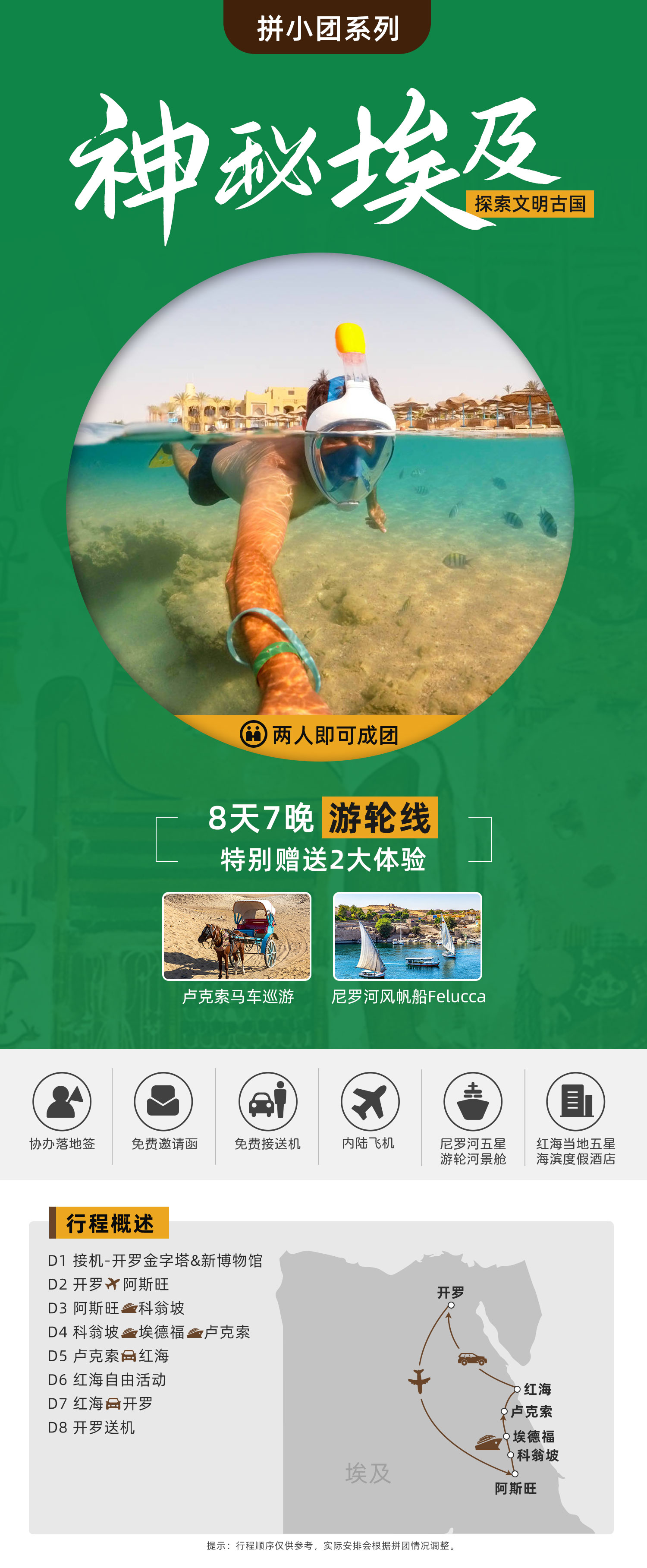 路线名称:<拼小团>【游轮线】埃及开罗+红海+卢克索+阿斯旺8日游 (落地签) ; [ 中东非旅游, 中东非 ]