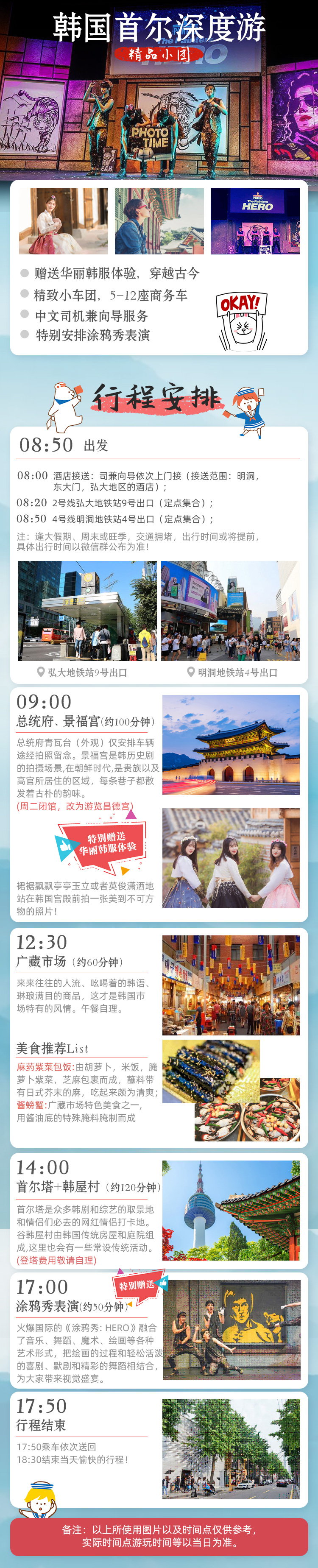 行程索要:首尔-景福宫-青瓦台-广藏市场-首尔塔-韩屋村-涂鸦秀表演-首尔
