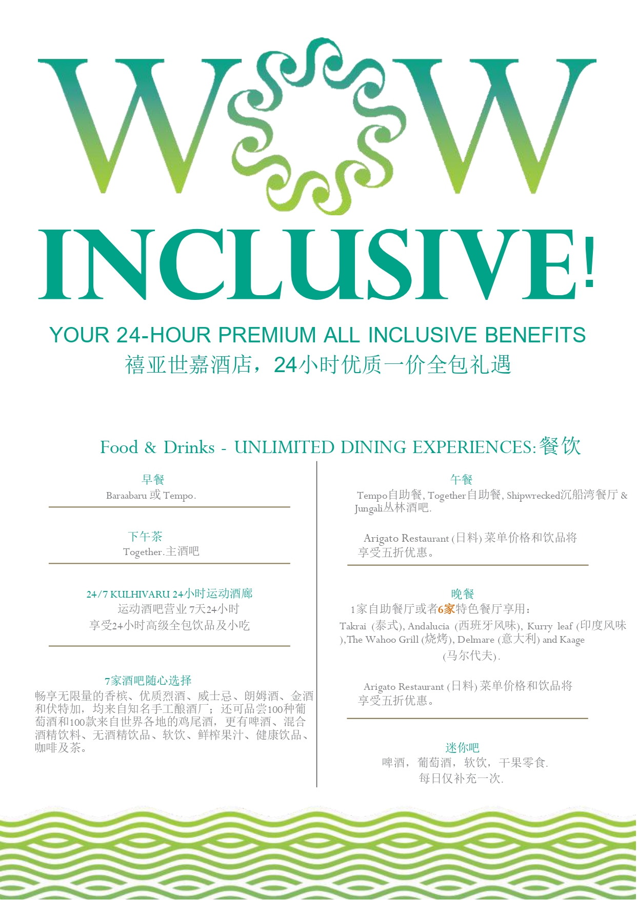 ⑥8家酒吧的随心选择,享受无限量的香槟,高级烈酒,威士忌,朗姆酒,杜松子酒和伏特加-均来自著名的手工酒厂,100多款酒标的葡萄酒,啤酒,鸡尾酒,非酒精饮料,软饮料,新鲜果汁,健康饮料,咖啡和茶。