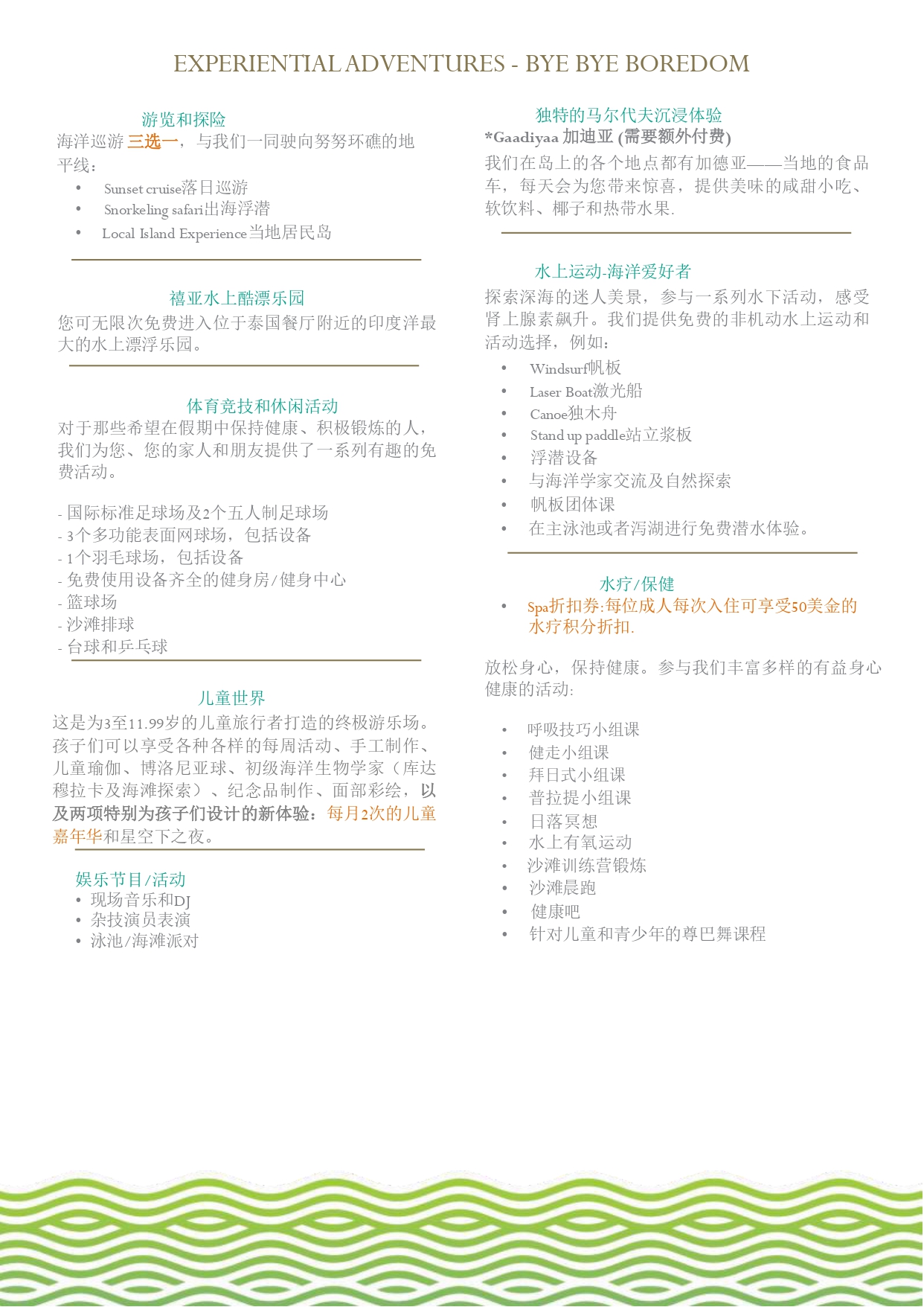 ⑦水疗和保健:放松,保持健康,舒缓你的身体和心灵。参与我们大量有趣且有益健康的健身活动:
