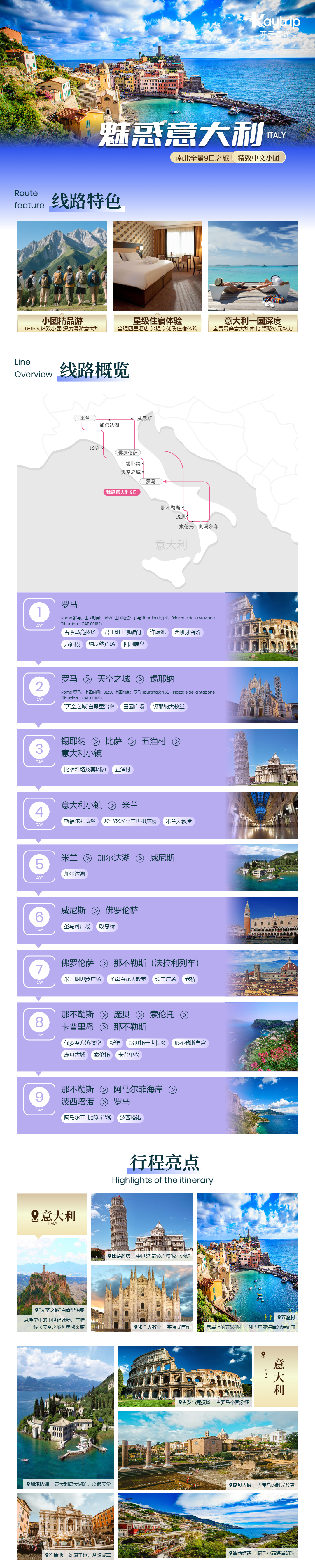 行程索要:罗马-天空之城-锡耶纳-比萨-五渔村-意大利小镇-米兰-加尔达湖-威尼斯-佛罗伦萨-那不勒斯-庞贝-索伦托-卡布里岛-那不勒斯-阿马尔菲海岸-波西塔诺-罗马
