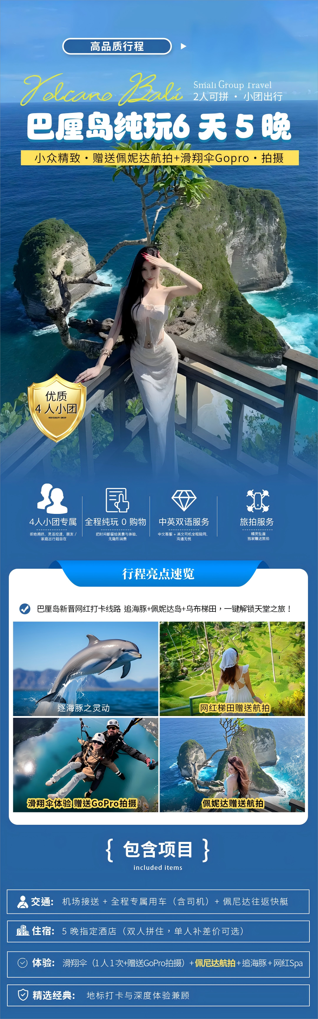 路线名称:印度尼西亚巴厘岛·纯玩6天5晚英文4人团进阶版(含滑翔伞+ATV) ; 小众精致·2~4人四星小团深度游含滑翔伞+网红瀑布+SPA·赠送佩妮达航拍 [ 亚洲旅游, ]