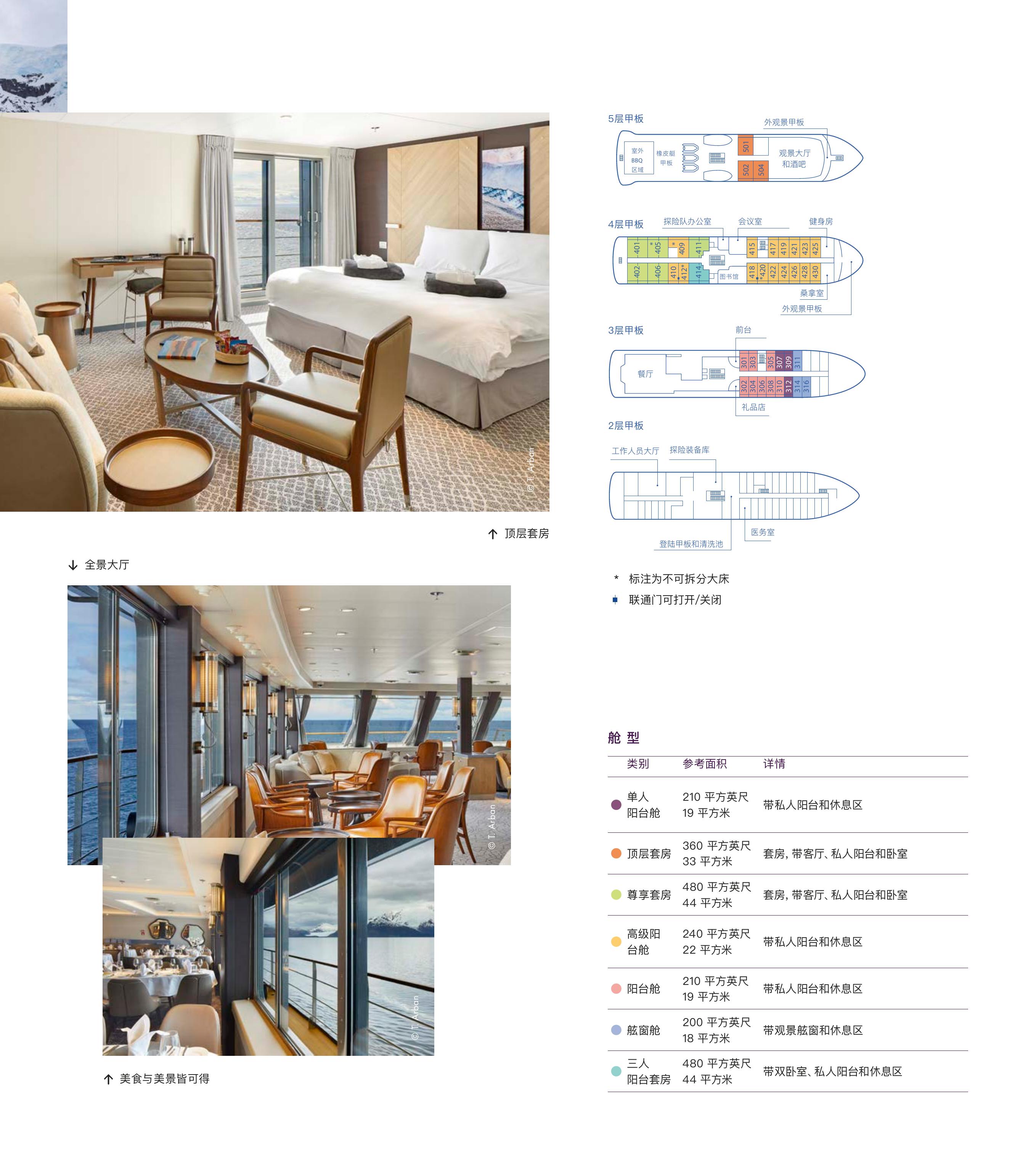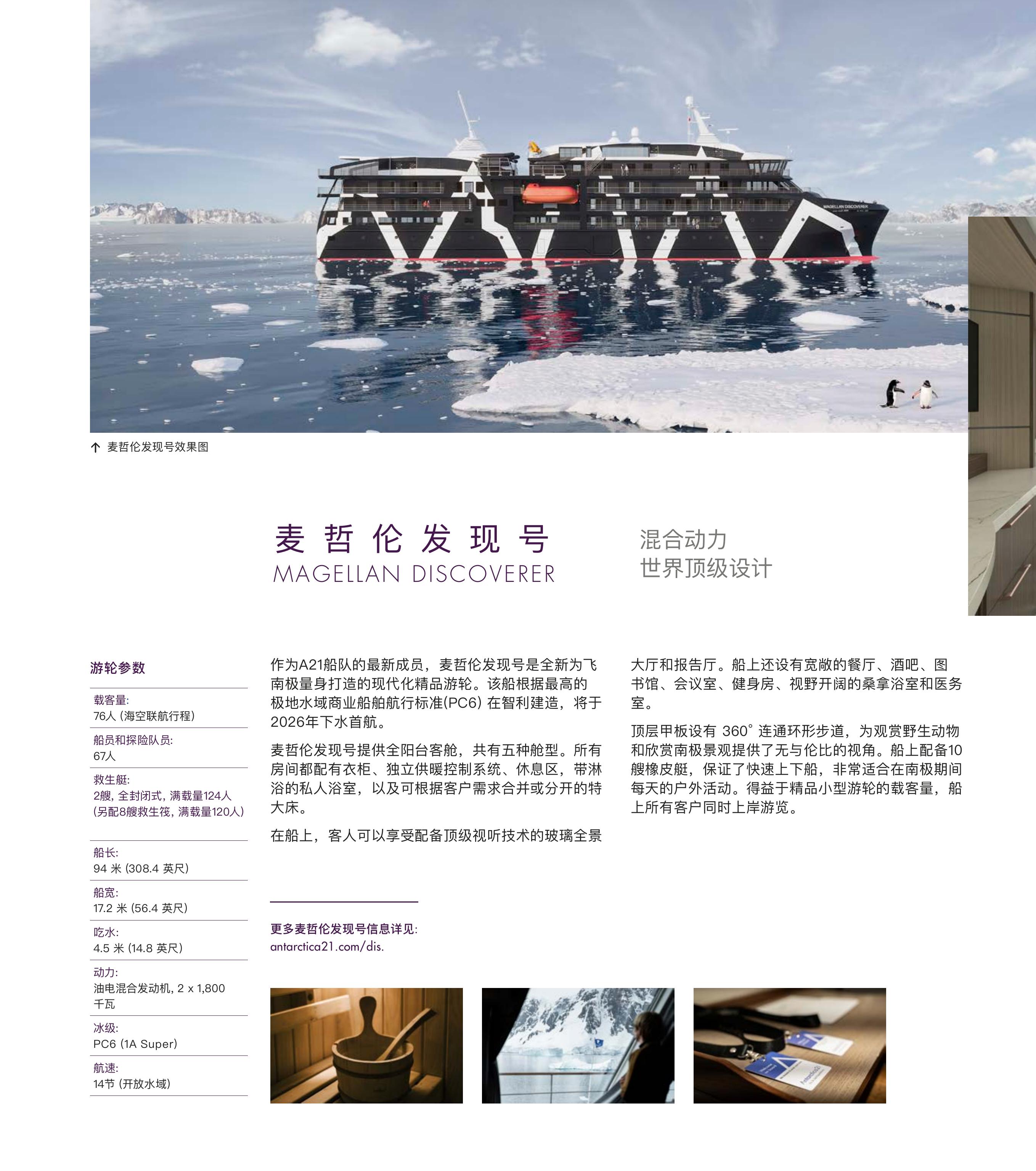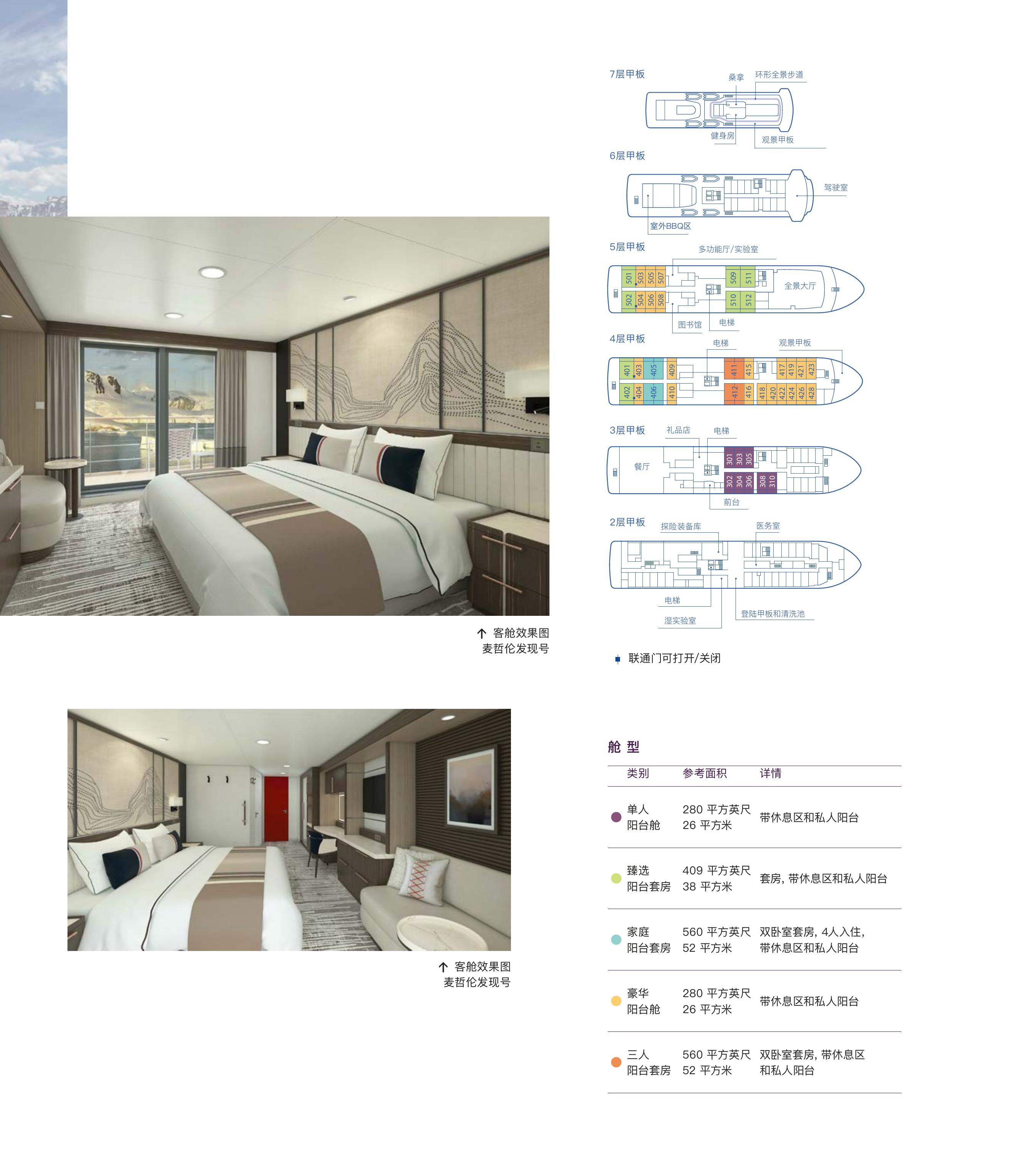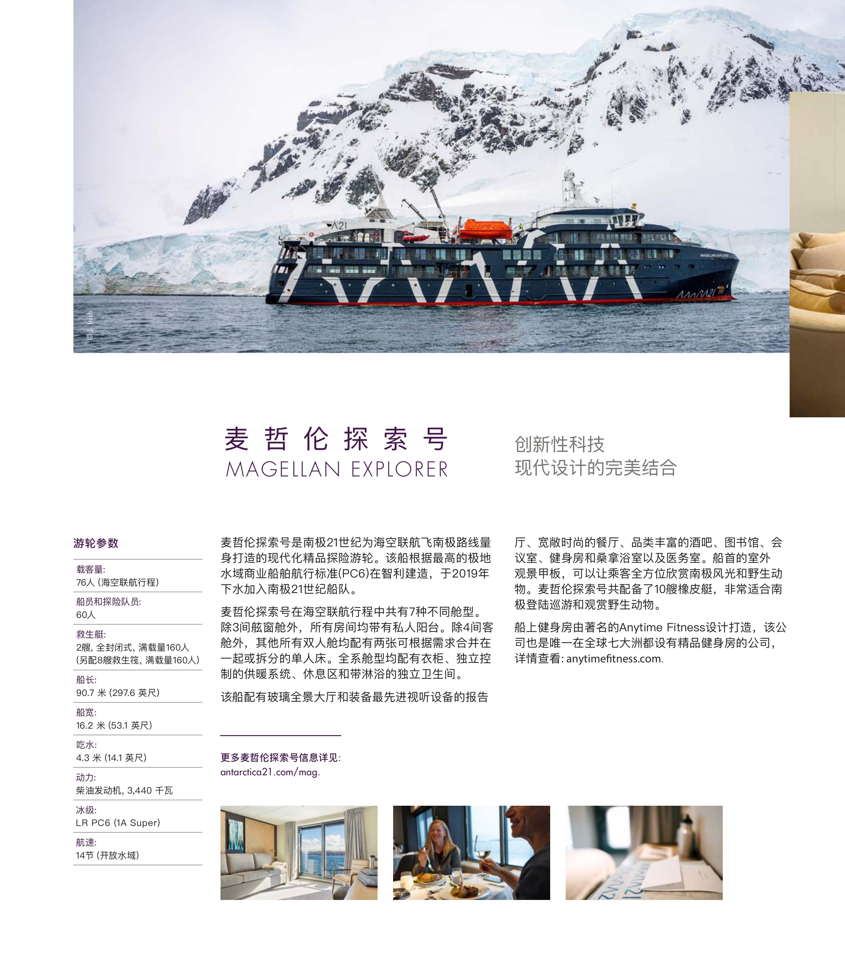 | 麦哲伦探索号 | 三人阳台套房 | 舷窗舱 | 阳台舱 | 高级阳台舱 | 尊享套房 | 顶层套房 | 单人阳台舱 | 皮划艇 | 雪鞋徒步 | ||||