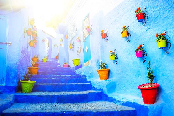 里夫山脉中的舍夫沙万是摩洛哥最上镜的城市之一。这座小山城所有的建筑都被涂成各种蓝色——从天蓝到靛蓝,从宝蓝到淡紫蓝。关于蓝色的起源有多种说法,有的说是为了驱蚊,有的说是犹太传统,有的则说是为了反射阳光保持凉爽。